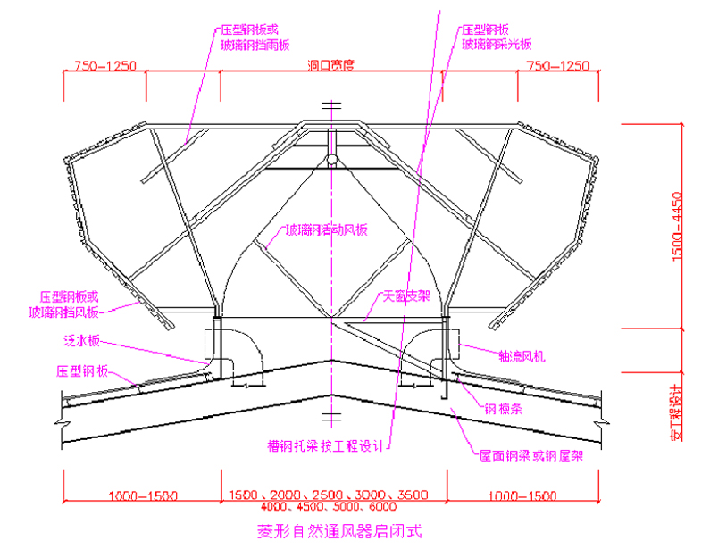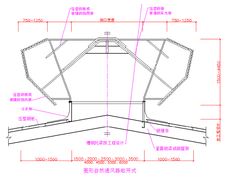 3000×n、4000×n (用于壓型鋼板或現澆混凝土屋面) 6000×n (用于預應力鋼筋混凝土屋面板屋面) |
